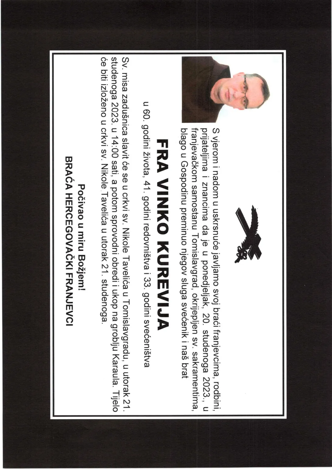 S vjerom i nadom u uskrsnuće javljamo svoj braći franjevcima, rodbini, prijateljima i znancima da je u ponedjeljak, 20. studenoga 2023., u franjevačkom samostanu Tomislavgrad, okrijepljen sv. sakramentima, blago u Gospodinu preminuo njegov sluga svećenik i naš brat FRA VINKO KUREVIJA u 60. godini života, 41. godini redovništva i 33. godini svećeništva