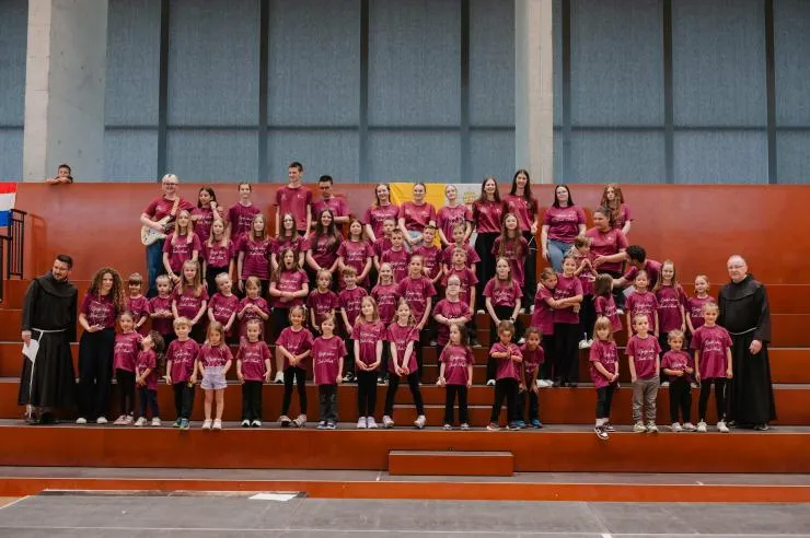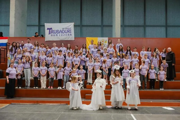 Nakon kratkog predaha nastavili smo s nastupom dječjih zborova. Program su radosno vodili fra Goran Azinović i fra Zlatko Ćorić, a svi prisutni su za vrijeme čitavoga koncerta prisutnošću i pljeskom podržali svaki zbor. U odnosu na prethodne godine, ovaj put su nam se pridružili i dječji zborovi iz misija Graubünden i Schaffhausen/Thurgau, što je i u već tradicionalnim sudionicima izazvalo obilje radosti. No, krenimo redom. Nastup dječjih zborova otvorili su „Zvjezdice Kraljice Mira“ iz misije Schaffhausen/Thurgau izvedbama, to jest mixom pjesama – „Isuse, volim te“, „Mi želimo uzdić Isusa“ i „Silan Bog“. Razigranom i vidno razdraganom dječicom ravnala je Antonija Bočkaj. Potom su binu zauzeli „Ruah kids“, dječji zbor iz Graubündena kojim su ravnale Karmela Vukasović i Marijana Šarić, a izveli su pjesme „Mi želimo uzdić Isusa“ i „Hosana“. Dječji zbor „Glasnici mira“ iz misije Aargau pod vodstvom s. Terezine Paluca i uz pomoć zbora mladih „Vis agape“, uz lijepu koreografiju su izveli skladbe „Ljubav Božja je predivna“ i „Mesija (On dolazi)“. Binu su potom zauzela djeca iz HKM Bern pod vodstvom Dominika Blažuna, te je zbor čije je ime ujedno i lijepi franjevački pozdrav „Mir i dobro“ izveo skladbe „Ovo je dan“ i „Veselimo se svi“. Već raspjevano mnoštvo dodatno su raspjevali i „Raspjevani anđeli“ iz misije Zug izvedbama skladbi „Djeluj kroz mene“ i „Ti si sveti“, pod vodstvom s. Anđele Pervan i uz dirljivo predstavljanje zbora jednog od njihovih najmlađih članova - Lorenza. Potom je, uz divne zvuke tamburica i pod ravnanjem Jelene Kučak-Vujnović, dječji zbor „sv. Tarzicije“ iz St. Gallena izveo skladbe „Evo me u domu tvome“ i „Velik si“. Veseli „Trubaduri sv. Franje“ iz Luzerna pod vodstvom s. Ana-Marije Biško izveli su skladbe „Isus te zove“, za koju je tekst napisala sama s. Ana-Marija, te „Anđeo budi“ – uz doista anđeosku koreografiju. Nastup zborova završio je lijepim izvedbama zbora domaćina „sv. Ante“ pod vodstvom Petre Hrvačić, koji nas je ove godine počastio skladbama „Bože, tebi pjevam ja“ i „Silan Bog“.