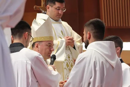 Dragi Tomislave, fra Ante i fra Davide, uskoro ćete primiti sakrament svetog reda u njegovu prvom stupnju. Riječ „đakon“ dolazi od grčke riječi „diakonos“, što znači sluga. To nije samo naslov, status, to je vaš identitet, način života. Bit ćete zaređeni ne da biste bili služeni, nego da služite. Bit ćete sakramentalno suobličeni Kristu koji „nije došao da bude služen, nego da služi i život svoj dade kao otkupninu za mnoge.“ U logici ovoga svijeta, veličina se mjeri time koliko ljudi vama služi. Uspjeh znači penjanje uz ljestve moći, stjecanje utjecaja, priznanja i časti. No, Krist to potpuno preokreće. U Njegovu kraljevstvu ljestve su okrenute naopako. Put prema gore vodi prema dolje. Put do veličine vodi kroz služenje. Put do prijestolja vodi preko ručnika i posude s vodom. Sveti Augustin nas podsjeća da je Krist „bio u Božjem obličju, ali uzeo je obličje sluge, Druga Božanska Osoba, po kojoj je sve stvoreno, kleknula je pred svoje učenike i oprala im noge. To je uzor vašeg đakonata. To je jedini ispravni način vašega služenja.