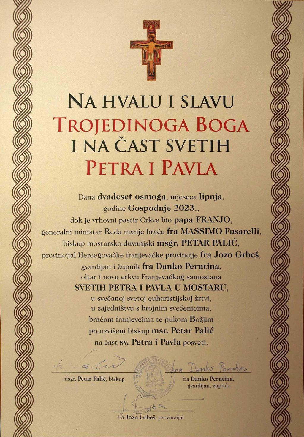 Na večernjoj sv. misi u 18 sati na uočnicu svetkovine sv. Petra i Pavla, zaštitnika mostarskoga franjevačkog samostana, crkve i župe, 28. lipnja 2023., mostarsko-duvanjski biskup msgr. Petar Palić posvetio je crkvu sv. Petra u Mostaru. Završni radovi na potpunom (unutarnjem) uređenju crkve završeni su prije koji dan pa je sve bilo spremno za već odavno najavljenu posvetu crkve – prekrasne, veličanstvene crkve, a koja je prije dvadesetak godina bila samo gomila ruševina stare crkve, uništene u ratu 1992. godine.