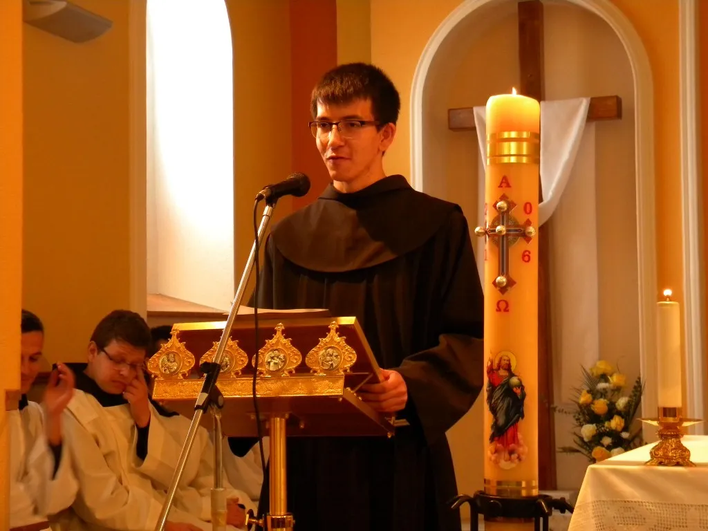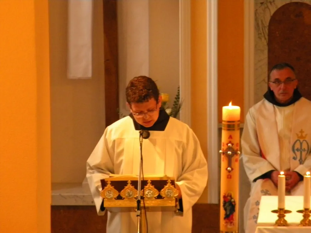 U jedanaest sati pjesmom Uskrsnu Isus doista počelo je euharistijsko slavlje. Misu je slavio meštar novaka fra Slavko, a koncelebrirali su župnik fra Vinko i naš meštar fra Stanko. Fra Stanko je također održao prigodnu i poticajnu propovijed o duhovnom i općenito o kršćanskom pozivu. Na kraju mise meštar je ukratko opisao naš cilj i najavio postulante koji će svjedočiti. Smisao i izgled postulature opisao je postulant Đuro Ravenšćak, a svoje osobno svjedočanstvo s ostalima je podijelio Ivan Malić. Potom smo otpjevali pjesmu Krist na žalu, a onda su uslijedili novaci. Fra Ivan Hrkać je opisao život u novicijatu, a fra Franjo Ćorić je ispričao svoj put do franjevačkog habita. Nakon svjedočenja novaka zapjevali smo još jednu duhovnu šansonu. Nakon mise smo se ispred crkve kratko družili sa župljanima. Bili su jako ljubazni i imali poticajne riječi za nas. Hvala im na tome.