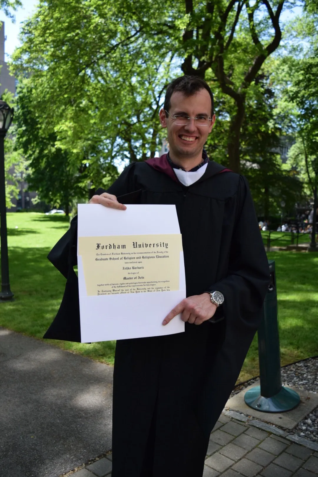 Ovom uglednom mnoštvu pridružio se ove godine i fra Željko primivši diplomu ovog eminentnog isusovačkog sveučilišta na kojem su, podsjećamo, prije par godina diplomirala druga dva hrvatska katolička svećenika. Fra Željko, rodom iz Širokog Brijega u Bosni i Hercegovini, trenutno djeluje kao svećenik u hrvatskoj župi svetih Ćirila i Metoda i sv. Rafaela u New Yorku, a svoj pastoralni rad tijekom protekle dvije i pol godine spojio je s postdiplomskim studijem iz područja Pastoralne teologije na fakultetu Graduate School of Religion and Religious Education u programu pod nazivom Pastoral Mental Health Counseling. Tijekom studija uz petnaest potrebnih predmeta iz područja psihologije i teologije fra Željko je odradio i 600 sati praktičnog rada u Psihijatrijskoj bolnici Ramapo Ridge u Wyckoff, New Jerseyu pod stručnim vodstvom i uz nadzor svog mentora.