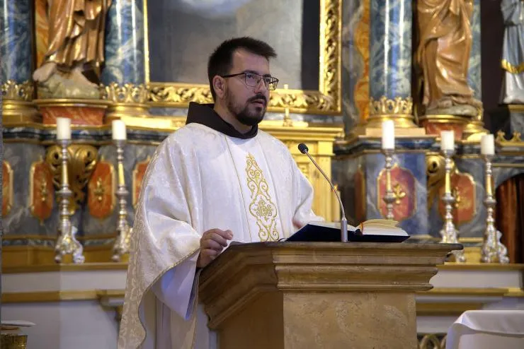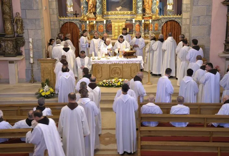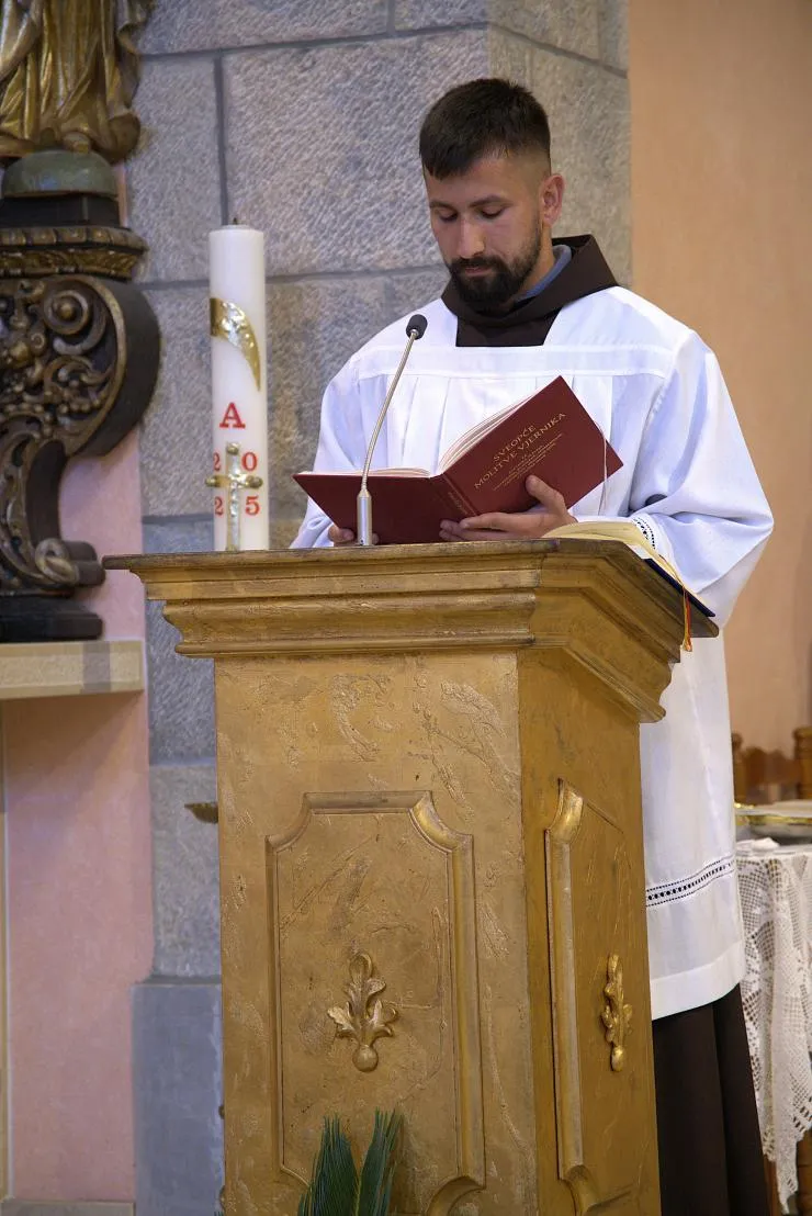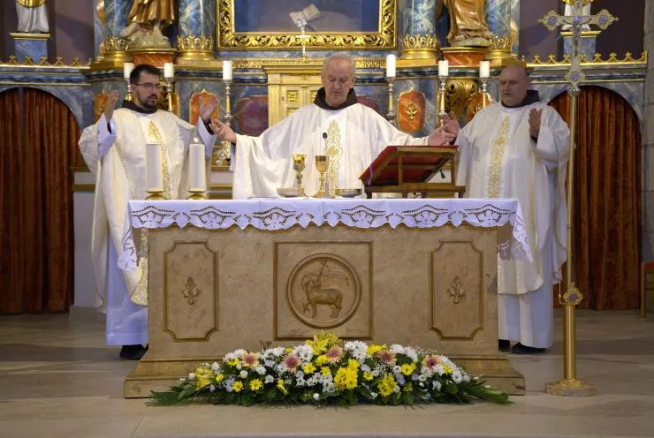 Nakon kraće stanke i mogućnosti za sakrament pomirenja, u staroj humačkoj crkvi provincijal fra Jozo Grbeš, u zajedništvu sa svojom braćom, predslavio je svetu misu. Liturgijsko pjevanje animirali su naši novaci i postulanti. Na završetku misnog slavlja humački gvardijan fra Miro Šego zahvalio je braći na dolasku te ih pozvao da, kao i obično, u duhu franjevačkoga zajedništva, nastave susret bratskim objedom u samostanskoj blagovaonici.