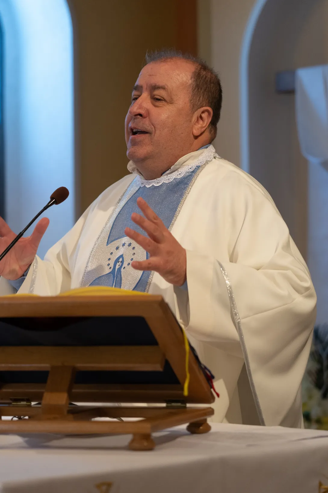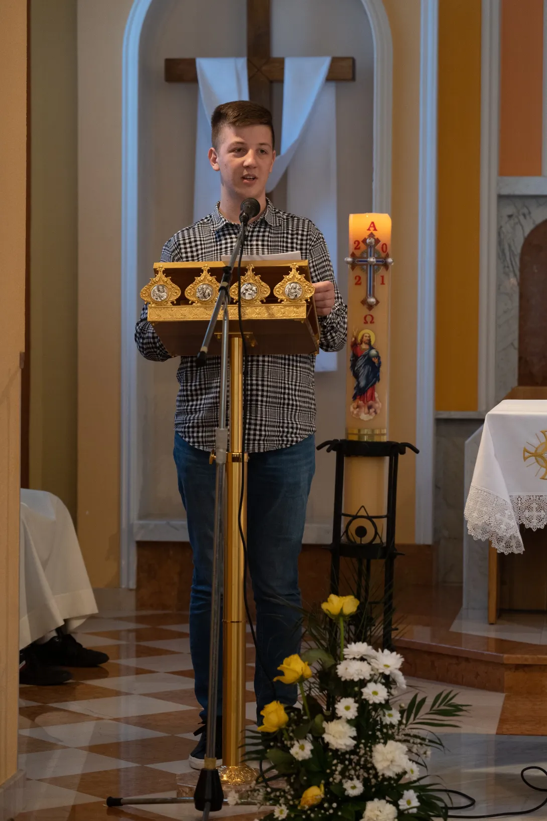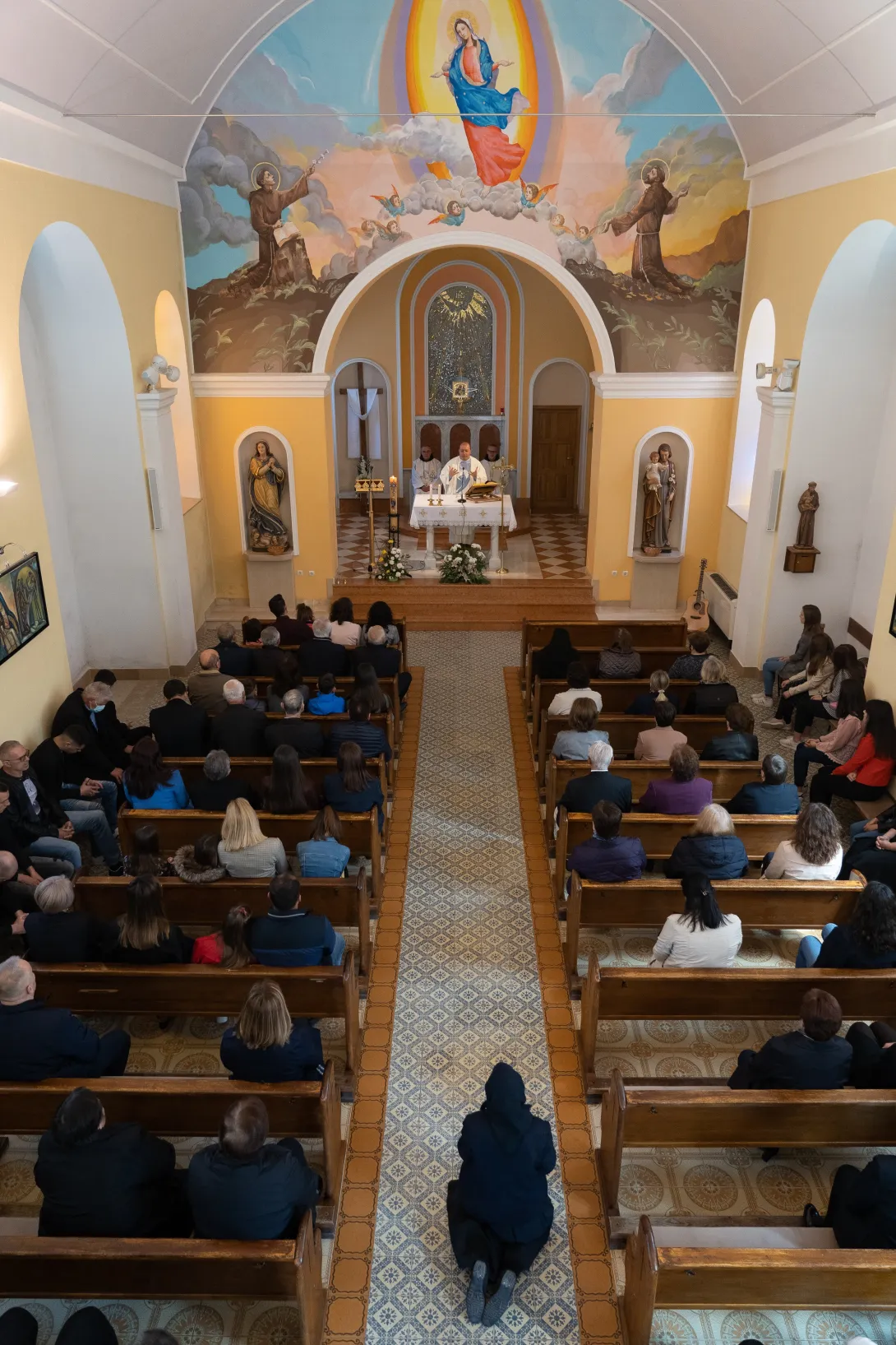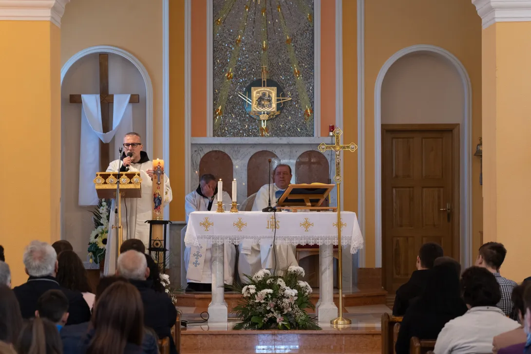 Pučku misu u 11h predslavio je vikar provincije i meštar postulanata fra Iko Skoko, uz fra Iku koncelebraciji su se pridružili župnik fra Vinko i fra Ante Kelava, novak. Misu su pjevanjem uzveličale zajedničke snage postulanata i novaka pod vodstvom i dirigiranjem fra Stanka Mabića, meštra novaka. U homiliji, fra Iko je naglasio prigodnost i zahvalnost ovog susreta povodom „Nedjelje Dobrog Pastira“. Istaknuo je simboliku koju ostavlja evanđelje, kao dubok dojam na čovjeka, usporedio je dobrog pastira i onog najamnika koji ostavlja ovce pred opasnošću usmjerujući pogled na vlastite interese. Glavna razlika između najamnika i pastira je ljubav prema ovcama, tako Bog iz ljubavi prema nama daje svoga Sina, koji polaže svoj život za ovce svoje. Fra Iko je spomenuo duhovni poziv koji Gospodin upućuje mladićima i djevojkama, i kako se odazvati na taj zov. Također je u homiliji izrazio zahvalnost Bogu i župljanima koji vjerno mole za duhovna zvanja, ali i na onima koji su potekli iz te župe.