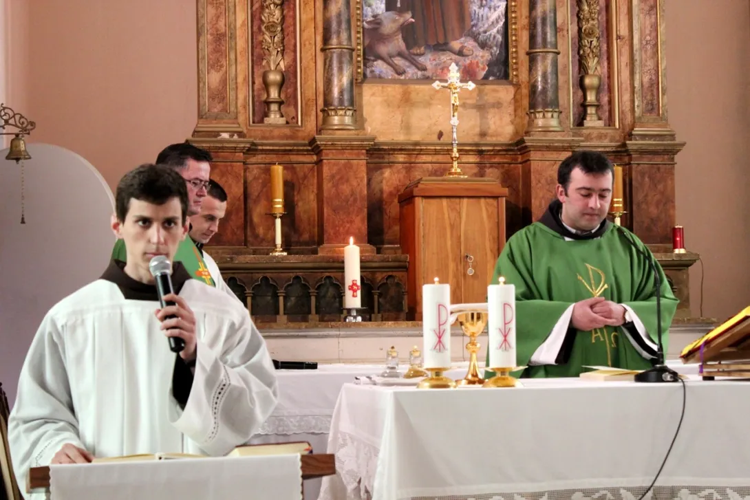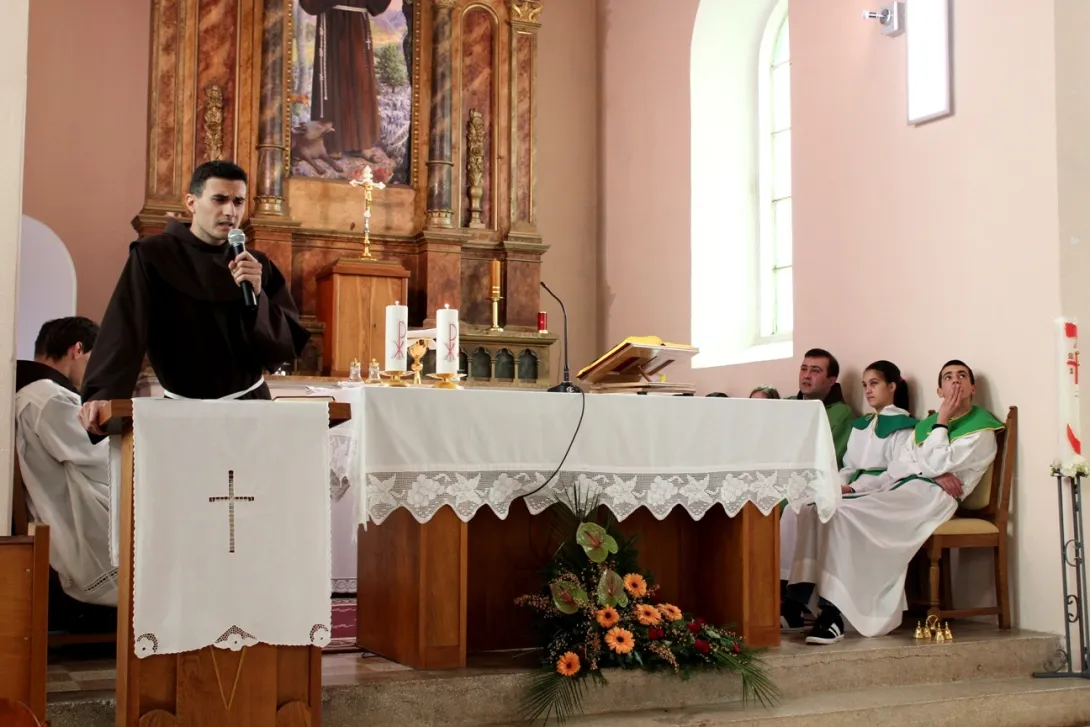 U 11 sati počelo je misno slavlje, a crkva je bila prepuna. Misu je predvodio fra Antonio Šakota uz koncelebraciju župnika fra Ignacija. Fra Antonio je održao prigodnu propovijed gdje se osvrnuo na našu kršćansku nadu u današnjem vremenu, a i na duhovni i općenito kršćanski poziv. Na kraju sv.mise posvjedočili smo o svome putu i o svome pozivu. Ante Begić je predstavio program postulature u Mostaru, a Vinko Baćak nam je posvjedočio o svom životu i pozivu. Također i novaci, fra Ivan Tomić je predstavio novicijat na Humcu, a fra Ivan Malić svoj životni put do franjevačkog habita. Nakon svega zapjevali smo duhovnu pjesmu i izvan crkve popričali s vjernim pukom koje je očito dojmilo naše svjedočenje. Dali su nam mnogo poticajnih riječi i obećali moliti za nas. Hvala im.